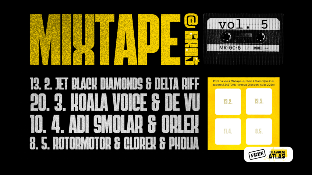 Zato vsaka edicija prinese štiri unikatne večere, kjer se srečajo novi glasbeni obrazi in uveljavljena imena slovenske scene. Mixtape ni le koncert. Je doživetje, ki zmeša stile, generacije in energije – tako kot pravi mixtape.
