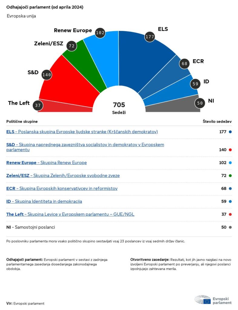 najmanj 6 in največ 96. Izvoljeni poslanci se po izvolitvi ne delijo glede na narodnost, temveč na svojo politično usmeritev. Trenutno so združeni v 7 političnih skupin. Po sestavi parlament izvoli še predsednika Evropskega parlamenta in Evropske komisije. (1)